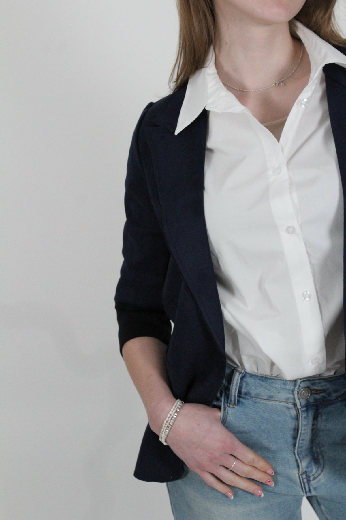 Il design con maniche 3/4 risvoltate e colletto a camicia dona un tocco di classe e modernità.